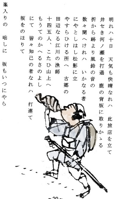 まず、 最初に研究のきっかけはそういうことで始まったわけですけども、 わずか 1 冊のごく短いその紀行文といいますね、 旅をしたという旅日記です。 絵を入れて、 非常にこう楽しく書いておる絵なんです。 今日のお配りした資料の中にもこういう面白い絵がいっばい出てきますから。 これは、 そこへ字を書きにきた本人の姿なんです。 そういう姿の絵をいっばいこの中に入れてあります。 いかに絵が上手であったか、 そして人柄が非常によくわかるような自画像がたくさんでてきまいります。 非常に面白い文章だったんですが、 字はそこに入れておりますように非常に難しい字なんで、 読むのに難儀いたしました。だから、その当時読んだものを細谷さんなんかが、 こう色々考えられましたけども、 私はそのときにはまだ「塩崎」 という姓と「塩路」 という姓が2つ非常に紛らわしく出てくるんですね、この資料の中に。それが、まだはっきりしてなかった。だから、非常なる誤解を与えてきたと思うんです。 今日は、 だぃたぃ何故僕がその読み方を間違えたのかということもお話をしたいと思いますけども、 「塩路」 「塩崎」 姓というのは非常にややこしいですけども別人なんですね。 それがはっきり出てくると。