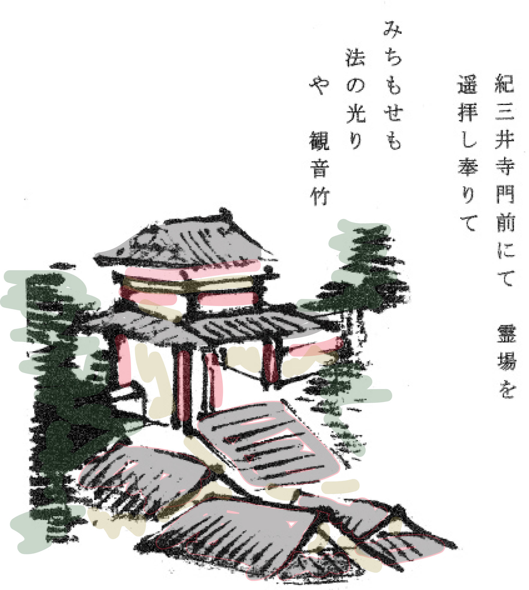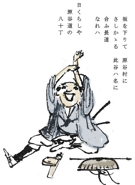 の一句と、自画像らしい旅姿の武士を軽妙に描いている。和田川を渡り、紀三井寺門前を通り、内原で力士荒渡弥四郎の塚を見て、黒江、日方、藤白、加茂谷村、蕪坂、宮原、糸我峠を経て、湯浅の「広屋」にて一泊する。