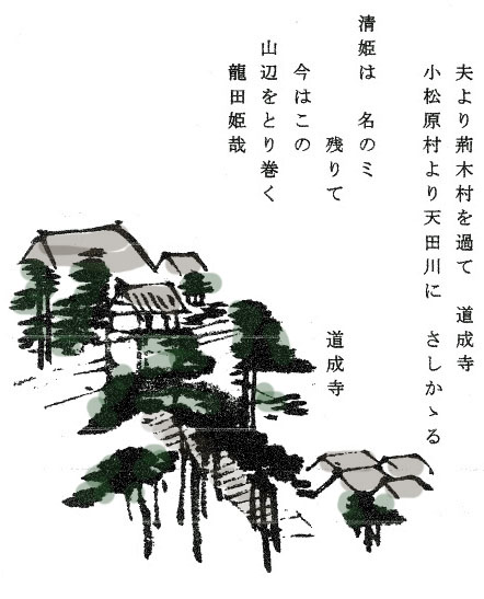 以上が昔の地形である。その後数百年の長い間に海は土砂に埋まり、日高川の流れも移り広い入り江は数里にわたる肥大な平野となり、そこには村落が密集し、区分された田地が遠くまで広々とかすんでいる。海岸には翠の松林が眉墨を掃いたように数里も続く姿は四季を通じて、えもいえぬ眺めである。花の朝、月の夕の美景は千年前と同じである。これこそ群中の別世界と言えよう。